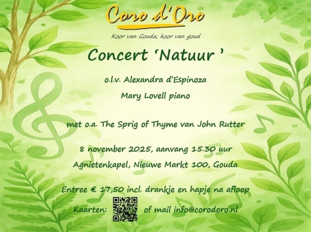 Kamerkoor Coro d’Oro uit Gouda geeft haar jaarlijkse “Grote Concert” in de prachtige Agnietenkapel, dit keer met thema “Natuur”. Met liederen van Rutter, Dvorak, Brahms en andere componisten. Een gevarieerd programma over vogelzang, verdriet bij de treurwilg, een romantische maan, zonsopgang en meer!